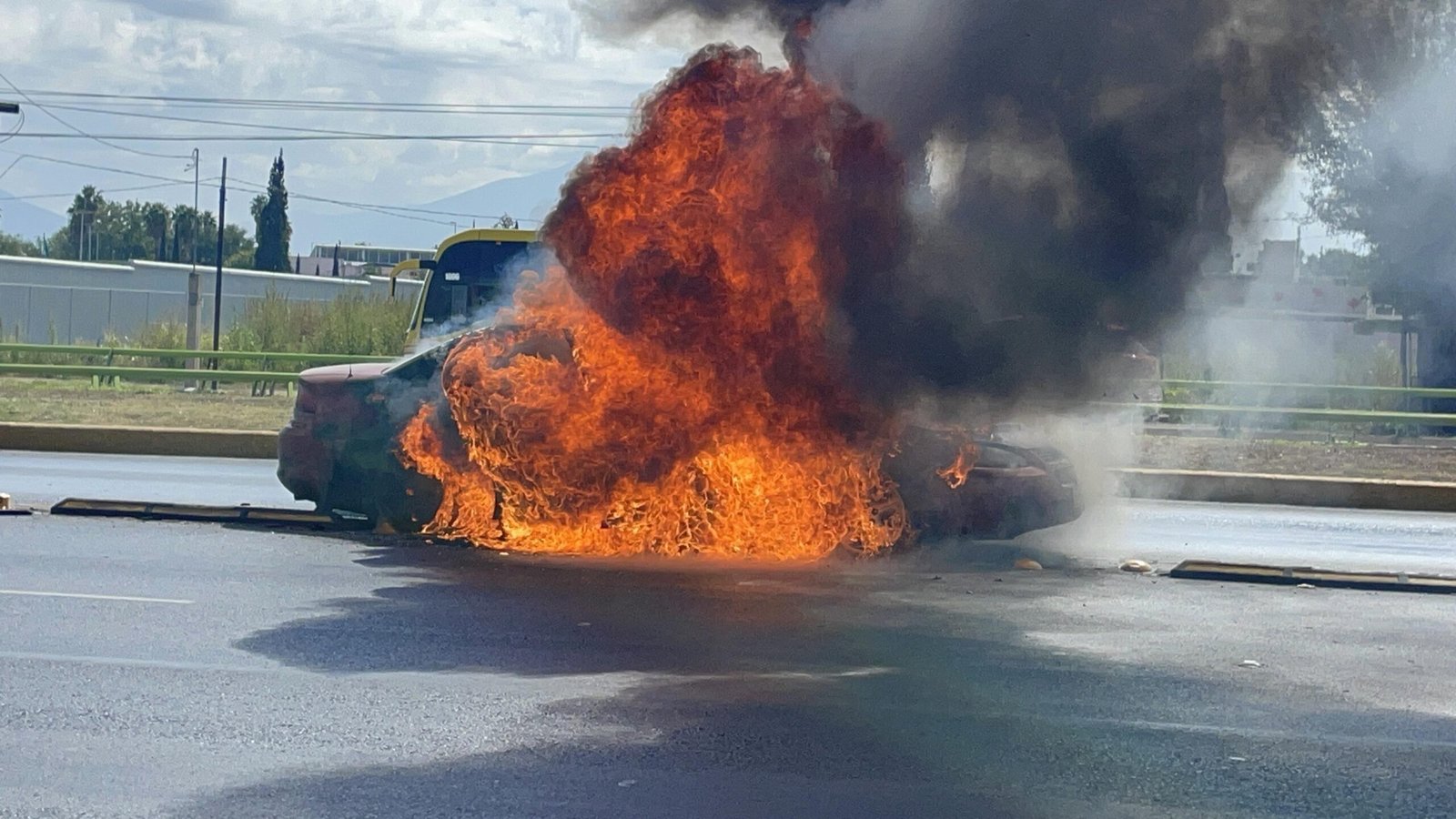 Completamente calcinado terminó un vehículo la mañana de este sábado sobre el bulevar Venustiano Carranza, antes del distribuidor vial del mismo nombre, lo que provocó pérdidas materiales y caos vial, en Saltillo.