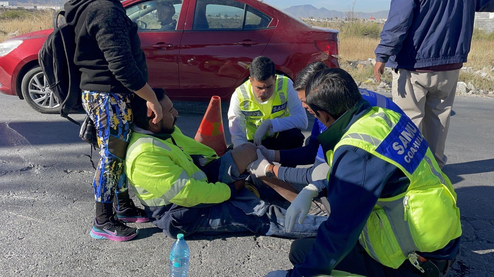 Personal de urgencias médicas de la Secretaría de Salud acudió para atender al lesionado, quien presentó un fuerte golpe en la rodilla izquierda, por lo que fue trasladado al nosocomio para recibir atención médica.