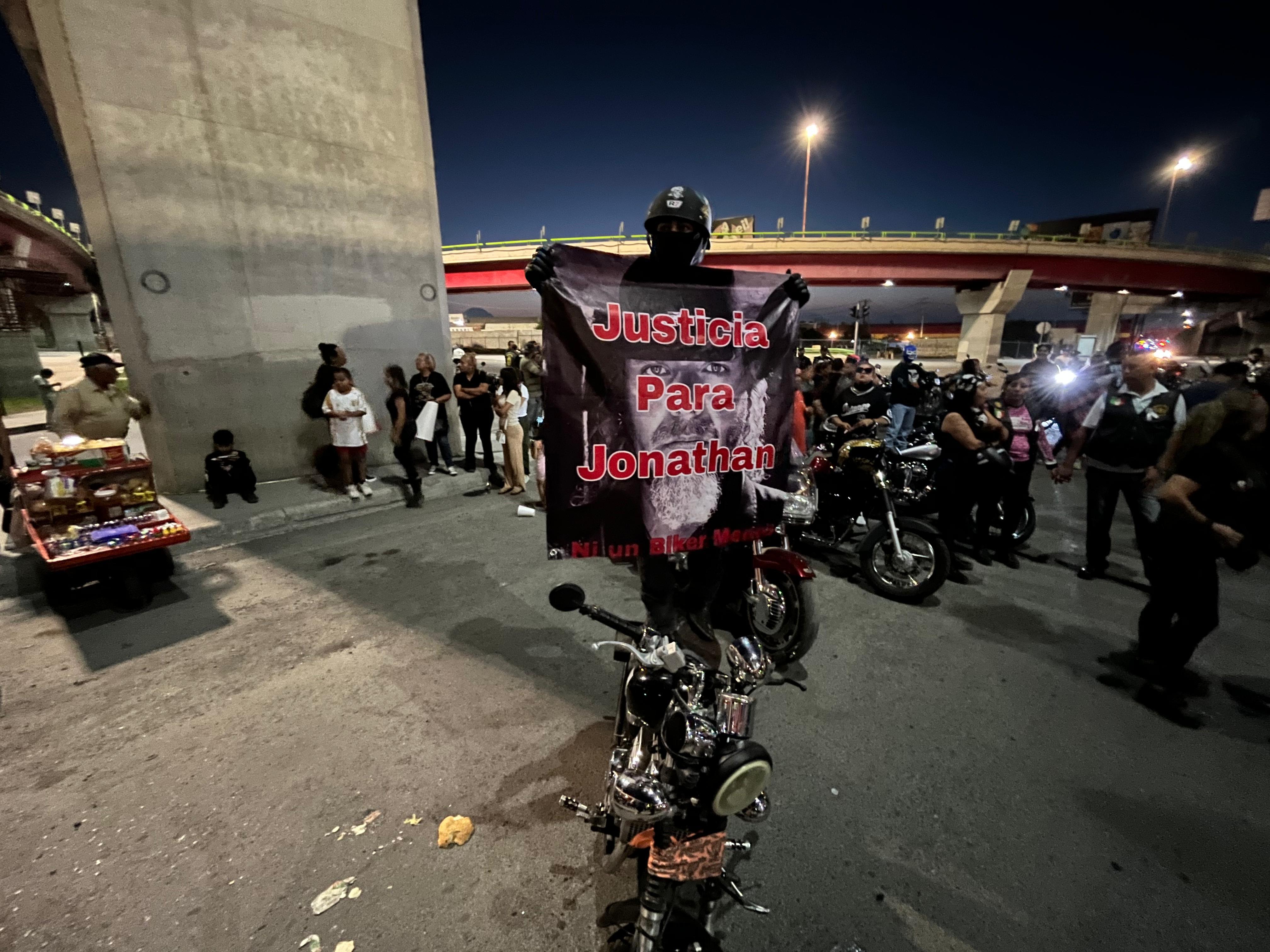 Los bikers acudieron con lonas y carteles con consignas como “Justicia no se ha hecho”, “una comunidad unida no guarda silencio”, “queremos justicia para nuestro hermano Jonathan” y “exigimos justicia real, no privilegios”.