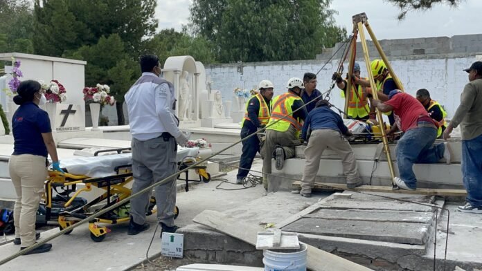 La persona lesionada fue identificada como Cristian David “N”, quien se encontraba realizando tareas en los alrededores de la sepultura perteneciente a la familia Reyes Patiño. De acuerdo con testigos, el joven pisó la losa de la tumba, que no soportó su peso, provocando su caída de aproximadamente tres metros.