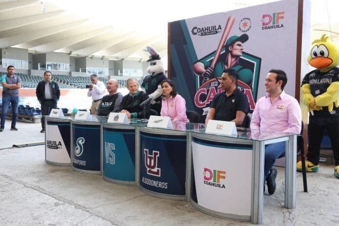 En rueda de prensa, directivos de ambos equipos y representantes del DIF Coahuila ofrecieron detalles sobre el encuentro. En el presidium estuvieron presentes Liliana Salinas, presidenta honoraria del DIF Coahuila; Jorge Verastegui, director de relaciones institucionales de Grupo Alianza y directivo del Club Saraperos; Francisco Méndez, director deportivo del Club Algodoneros de Unión Laguna; Enrique “Che” Reyes, manager de los Saraperos, y Alejandro Cepeda Valdés, director general del DIF Coahuila.