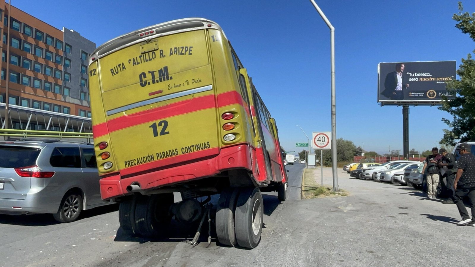 Un transporte público de la ruta Ramos Arizpe-Saltillo quedó apoyado sobre sus neumáticos traseros la tarde de este martes, luego de presentar una falla mecánica.