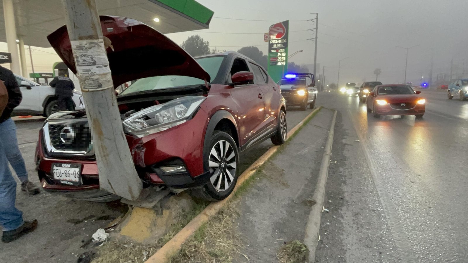 Esto provocó que saliera de la carretera de manera abrupta, subiera a una banqueta y finalmente se impactara contra un poste ubicado en una de las gasolineras conocidas como “Las Gemelas”, en la colonia Nogalar.