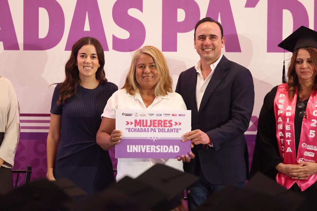 El gobernador de Coahuila, Manolo Jiménez Salinas, presidió la graduación de 659 mujeres que cursaron la preparatoria abierta a través del programa “Mujeres Echada Pa’ Delante”, con lo que se busca fortalecer su empoderamiento.