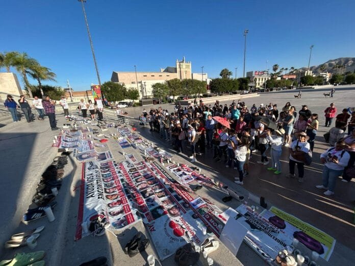 En el municipio de Torreón colocaron zapatos y veladoras en la Plaza Mayor de la ciudad y se realizó un acto donde las familias se unieron a la jornada de luto nacional por el hallazgo de la zona de exterminio de Teuchitlán, Jalisco.
