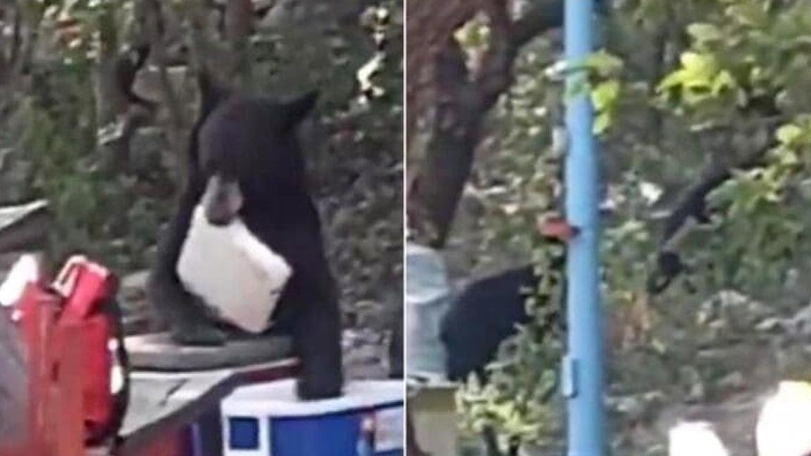 En las imágenes se observa cómo el oso se acerca con tranquilidad, mientras la familia intenta ahuyentarlo con gritos y ruidos. Sin embargo, el animal no se intimidó. Con gran destreza retiró la tapa de la hielera y sacó un plato con cortes de carne listos para la parrilla.