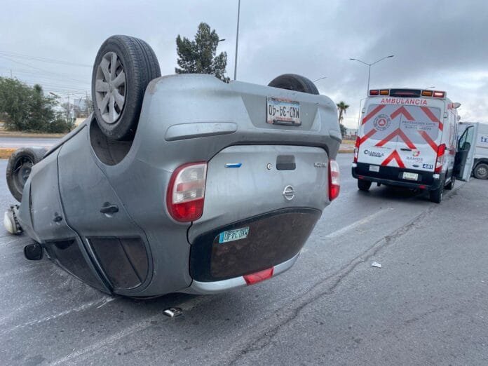 La mañana de este viernes, un automóvil terminó con el toldo contra el pavimento luego de que su conductor se distrajera mientras circulaba por el bulevar Miguel Ramos Arizpe, en el vecino municipio de Ramos Arizpe.