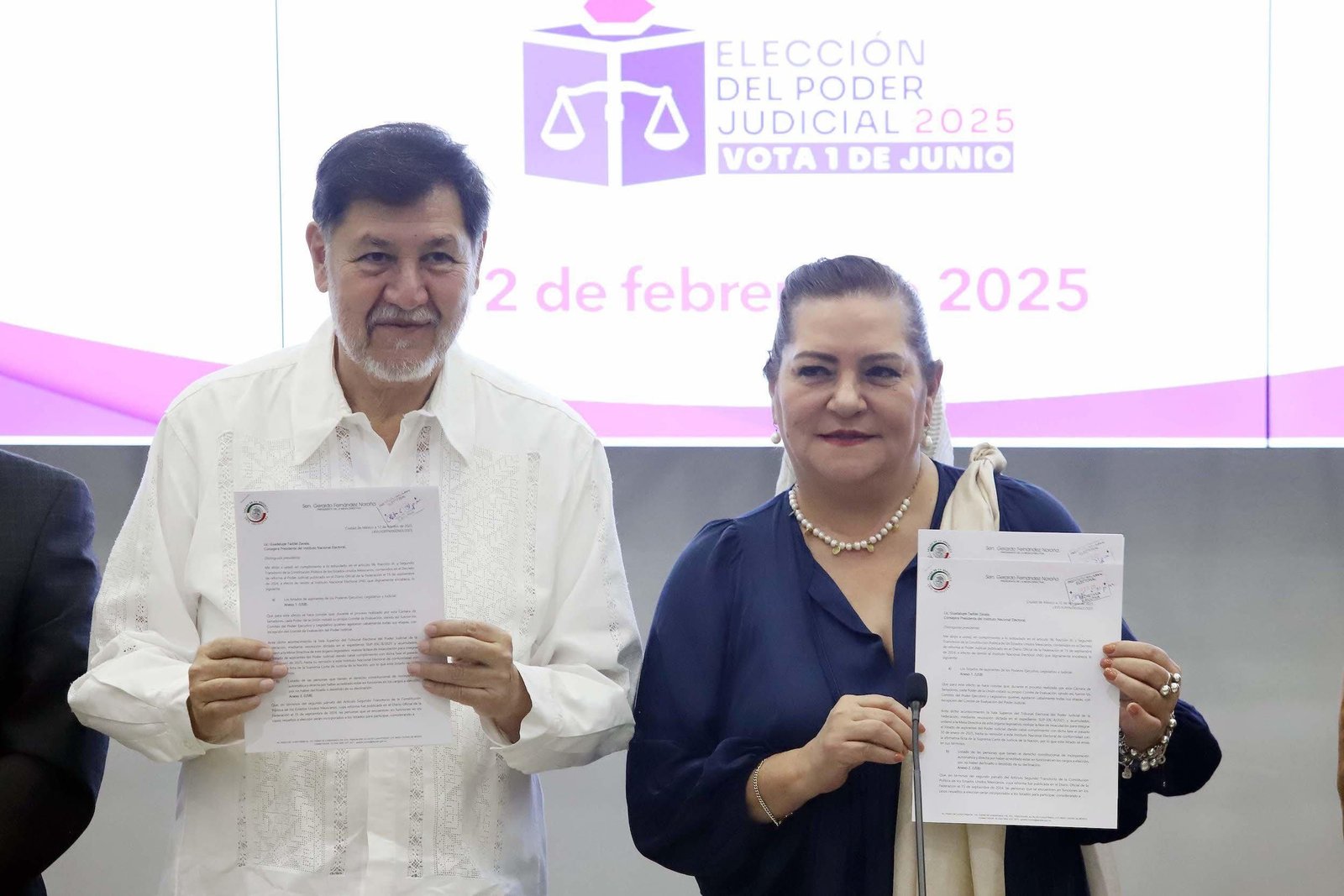 El Senado de la República, en una ceremonia encabezada por el presidente de la mesa directiva Gerardo Fernández Noroña, junto a la consejera presidenta del Instituto Nacional Electoral (INE), Guadalupe Taddei Zavala, entregó de manera formal los nombre de las personas candidatas que aparecerán en las boletas del proceso electoral al Poder Judicial.