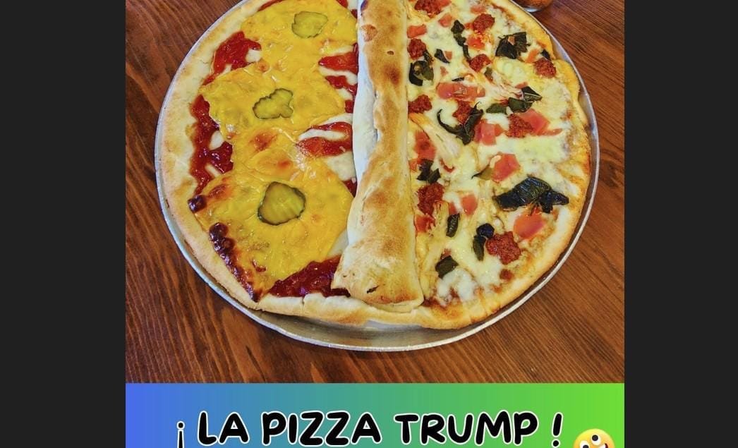 La Pizza Trump está dividida en dos mitades bien diferenciadas. Del lado estadounidense, los ingredientes reflejan una versión decepcionante de la comida rápida: kétchup en lugar de salsa de tomate, queso amarillo mal derretido, pepinillos y, como lo describe la publicación, “sin carne, sin amor, sin sazón… pero con mucho ego”.