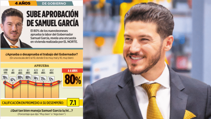 El Gobernador Samuel García creció en aprobación ciudadana, según la Encuesta 2024 de la plataforma Cómo Vamos Nuevo León. Con 64% de aceptación, 10 puntos más que en su primer año de gestión, el emecista quedó abajo del 87% de aprobación del Presidente Andrés Manuel López Obrador, pero arriba de la aceptación promedio de los Alcaldes, que fue de 52%.