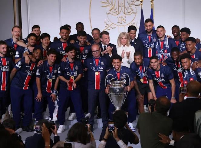 Macron dio la bienvenida al equipo Paris Saint-Germain a la capital francesa el domingo después de que los atletas vencieran al Inter de Milán 5-0 el sábado por la noche, alzando el trofeo de la Liga de Campeones por primera vez en la historia del club.