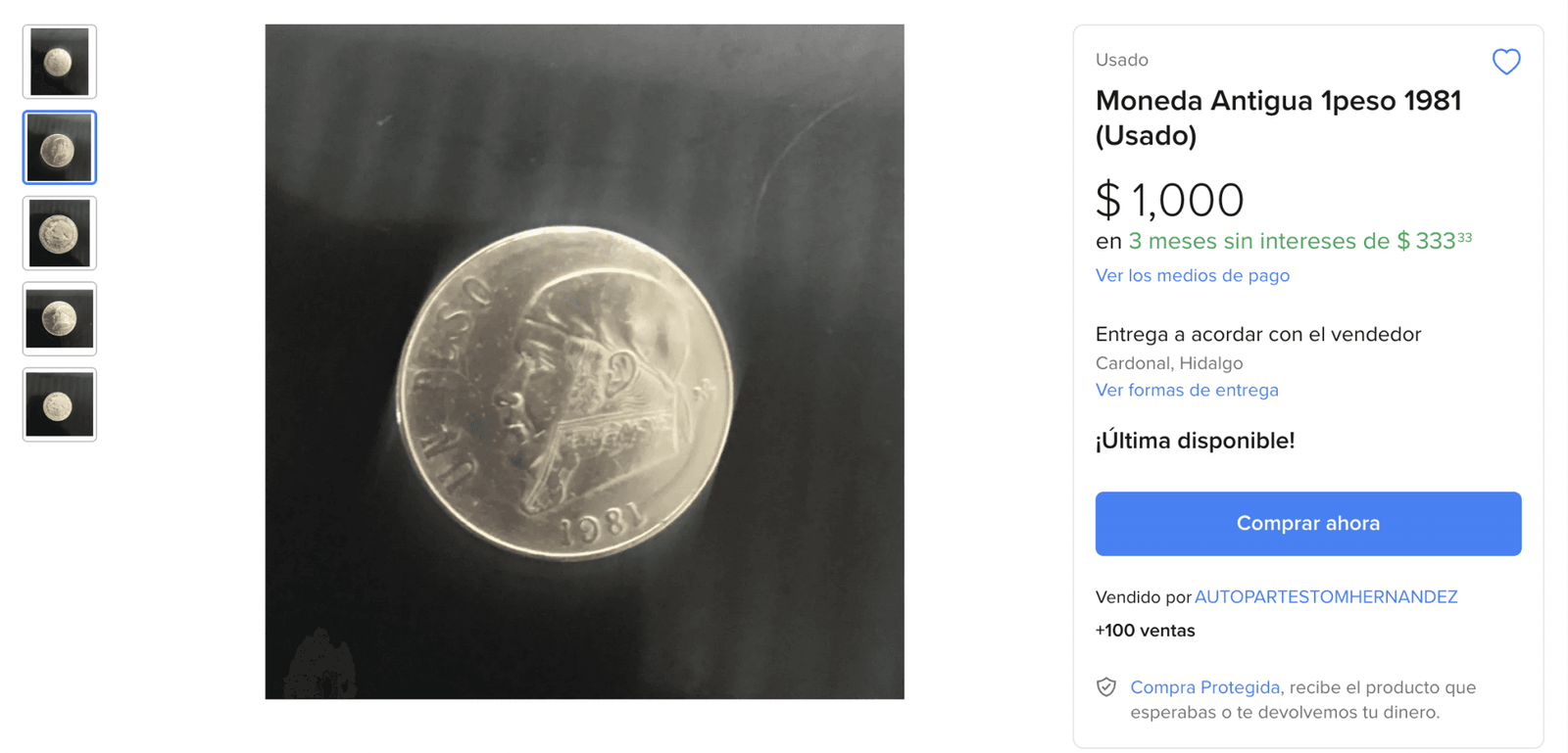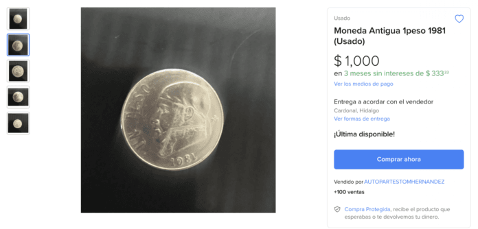 Plataformas en línea como Mercado Libre son el lugar ideal para encontrar monedas de este tipo. En una publicación reciente, una moneda de 1 peso de 1981 está siendo ofrecida por más de $1,000 pesos. Este precio refleja tanto su demanda como su escasez en buen estado.