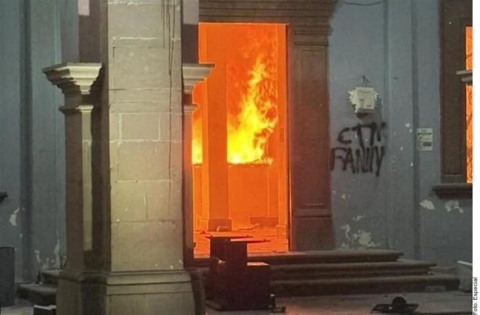 Frente al Palacio Municipal, manifestantes rompieron puertas, vidrios y entraron al inmueble donde provocaron un incendio en la planta baja del inmueble.
