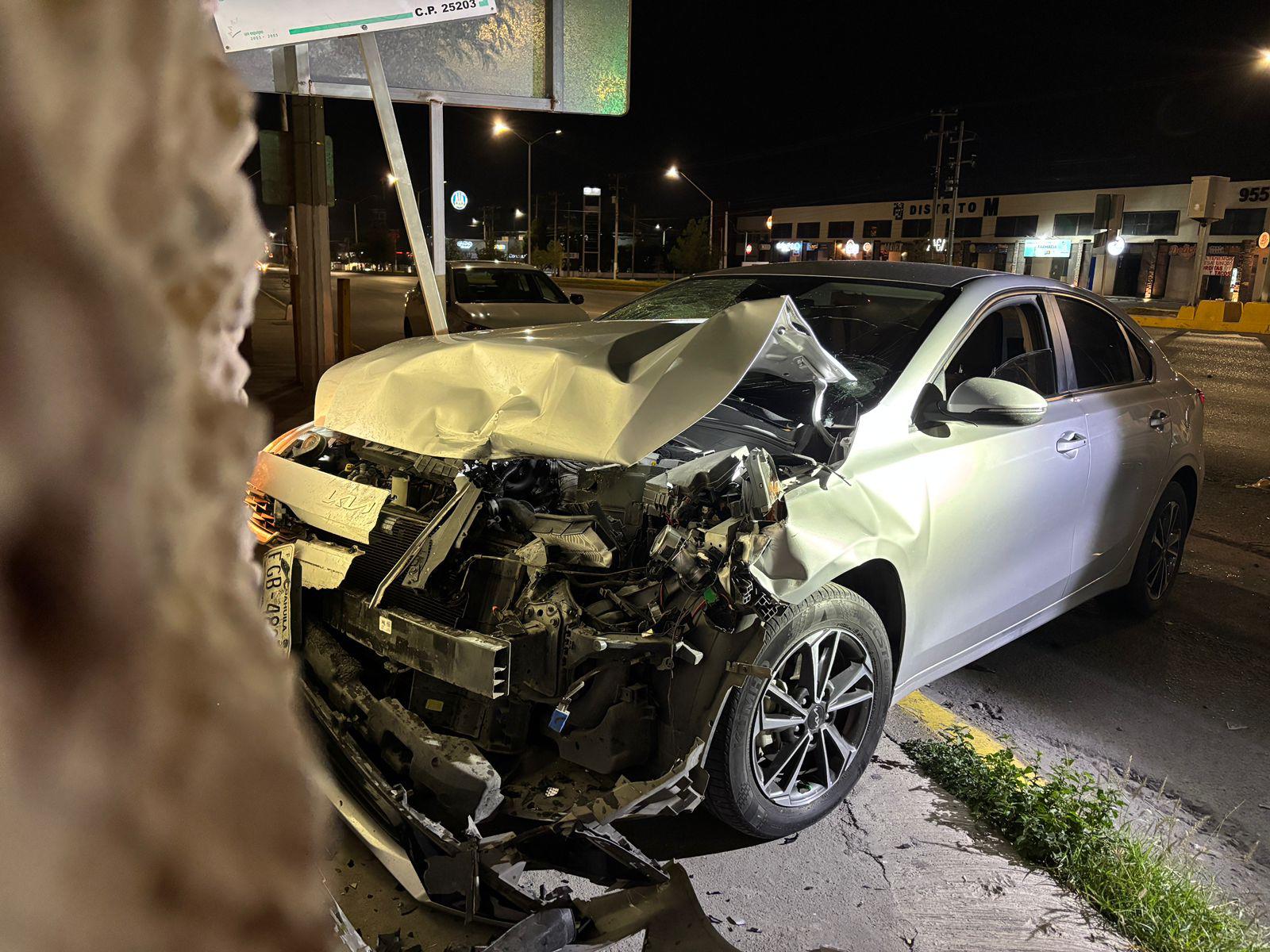El conductor de un vehículo Kia terminó impactado contra un muro tras chocar por alcance contra una camioneta que esperaba el cambio de luz en un semáforo, presuntamente por conducir a exceso de velocidad en Saltillo.