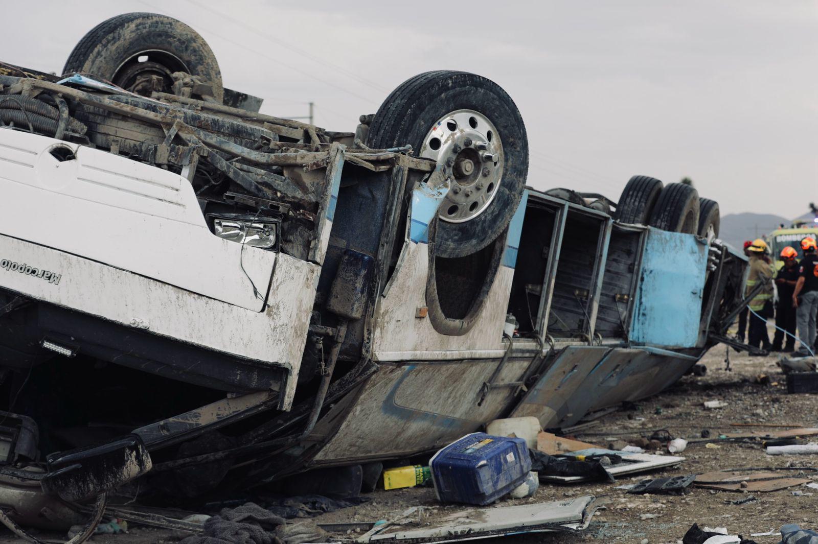 Un saldo de 15 personas heridas y dos fallecidos es el resultado de la volcadura de un autobús de pasajeros en la carretera Matehuala-Saltillo, este lunes, 21 de abril.