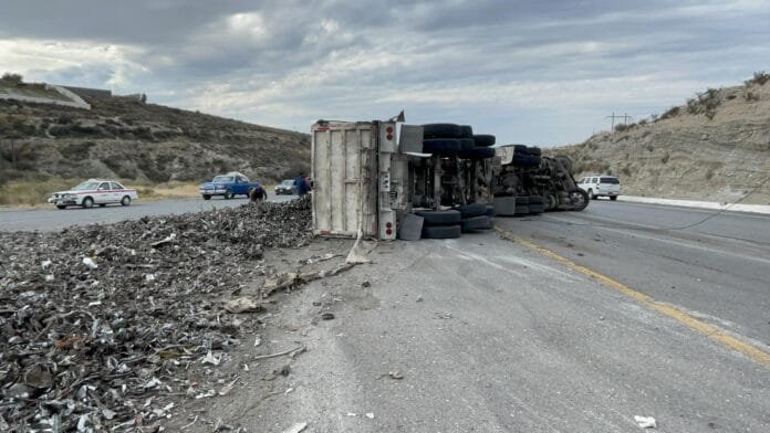 La tolva con toneladas de metal en pedacería volcó hacia su costado izquierdo. La carga, o la mayor parte de esta, salió disparada, quedando sobre el pavimento, lo que representaba un riesgo para los automovilistas y transportistas.