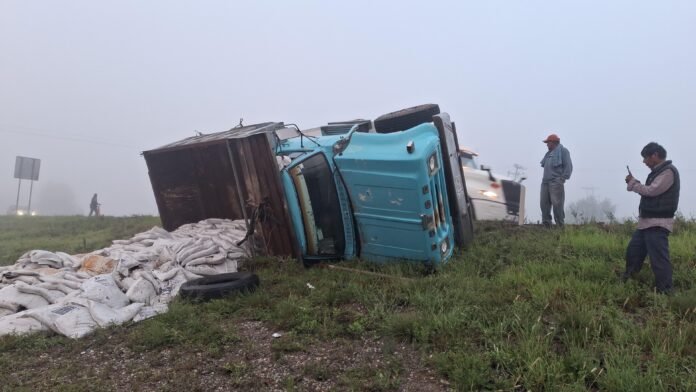 El conductor explicó que no se percató de la curva debido a la neblina y, al reaccionar, ya era demasiado tarde: la pesada unidad comenzó a ladearse hasta terminar recostada sobre su costado derecho.