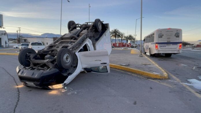 Con las llantas hacia el cielo terminó una camioneta de reparto la mañana de este miércoles tras atravesarse al paso de un camión de personal en el bulevar Venustiano Carranza, a la entrada de Saltillo.